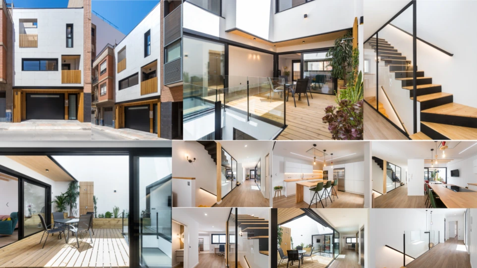 Vivienda de 300 m2 en tres plantas entre medianeras con un diseño exterior moderno que combina la ceramica blanca con detalles de madera muy tipicos nuestros. La distribucion esta pensada para hacer vida en torno a su patio central. Esta vivienda tiene cuatro dormitorios dobles y cuatros baños completos y su precio es de 291.800€ mas IVA llave en mano.